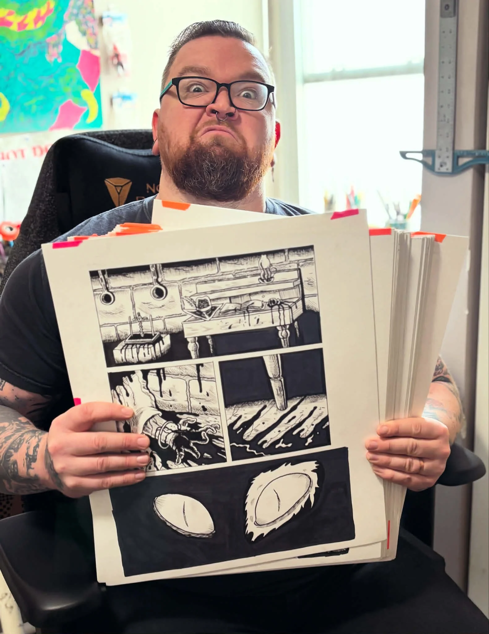 living and working in Baltimore, MD. He’s the creator of the Executioner and Friend cartoon and comics, as well as the I Live in Your Walls, Fight Frogs and Death Knight comic series’. He runs on heavy metal, horror movies, and slime.
